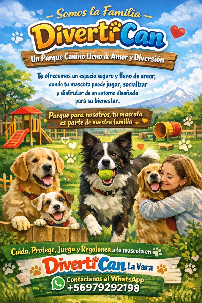 «Somos la Familia DivertiCan y te ofrecemos un espacio seguro y lleno de amor, donde tu mascota puede jugar, socializar y disfrutar de un entorno diseñado para su bienestar. Confiamos en el poder de la diversión y un lugar seguro para que el cuidado de tu mascota sea en cada visita una experiencia especial, porque para nosotros, tu mascota es parte de nuestra familia, cuida, protege, juega y regalonea a tu mascota en DivertiCan La vara, el primer y único Parque Canino de la Ciudad de Puerto Montt «